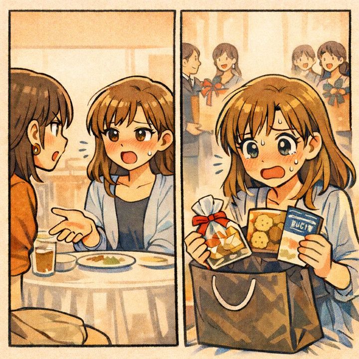 しかし、彼女の引き出物袋に入れたのは、スーパーで売っている「500円のクッキー詰め合わせ」と「近所のパン屋の割引券」のみ。