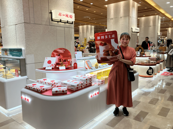 今回の出店は、長年「マイングNo.1おみやげ決定戦」洋菓子部門を牽引している「赤い風船」の店舗を半分リニューアルしたものだということで、とっても楽しみ! お店に行ってみると、新しい博多の味を求めるお客さんで絶え間なく賑わっていました。