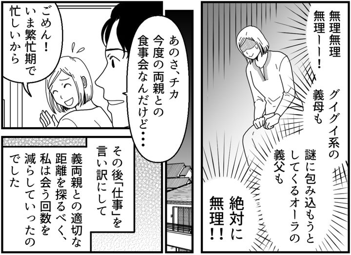 かといって新婚当時の私は、義両親を拒否することができませんでした。だから疲れない程度の付き合い方を探していこうと思ったのです。たまに会う分には我慢できるかもしれない……。そう思って義両親からの誘いに応じる回数を減らしていったのでした。