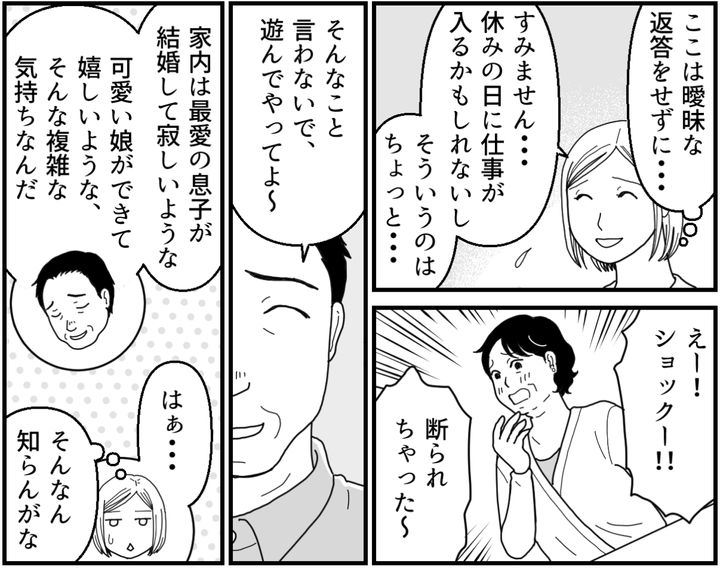 私がハッキリ断ると、義母は大げさなリアクションをしました。そういうノリも私は苦手です……。すると義父が勝手に私のことを娘扱いしてきたあげく、私の頭を軽く「コツン」としてきたのです。その瞬間、全身に鳥肌が立ちました。