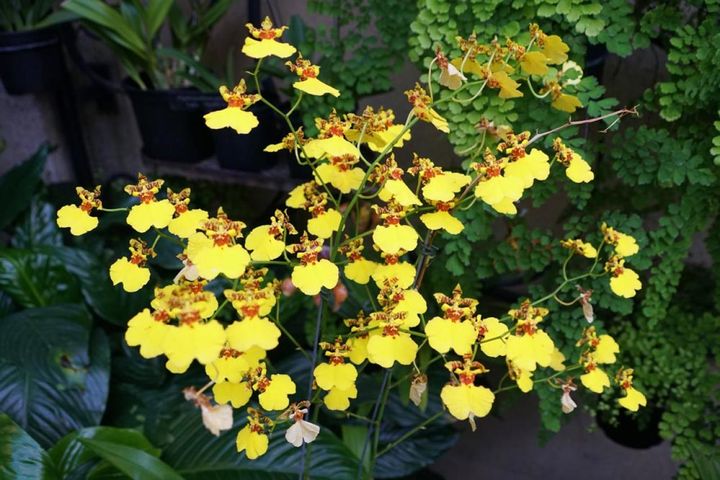 熱帯・亜熱帯アメリカ原産で、黄色の小花がたくさん咲くタイプが切り花でも多く出回ります。ラン展などでは高い位置にディスプレイされて、まるで光のシャワーが降り注ぐようです。香りもよい花を吊り鉢で飾るのがおすすめ。冬はレースのカーテン越しの日ざしで、最低5℃以上に保ちます。