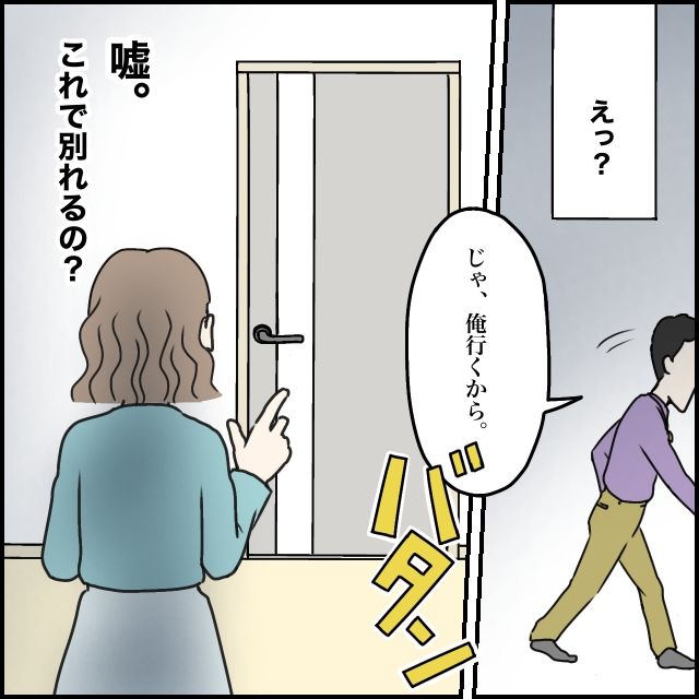 あまりに突然の別れの言葉に、私は頭が真っ白になりました。だけどタカシは、立ち尽くす私を気にも留めず、「じゃ、俺行くから」と言い残して部屋を出ていきます。嘘、これで別れるの?彼にとって私は、少しでも面倒なことを言えば簡単に切り捨てられる存在だったのでしょうか。