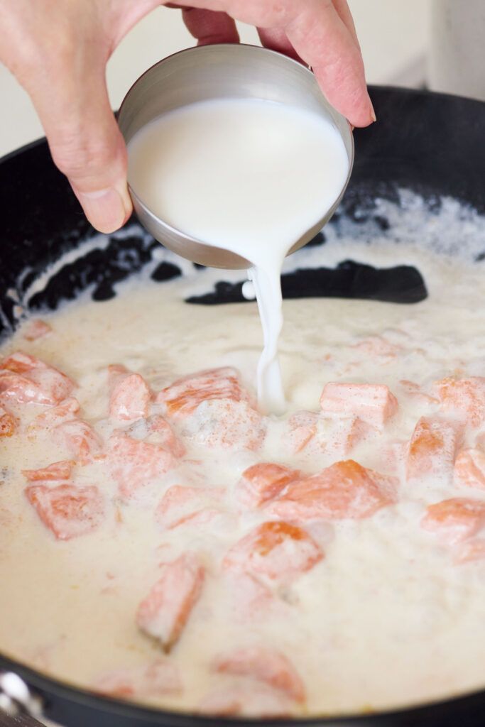 フライパンに米油大さじ1を強めの中火で熱し、鮭を入れて表面の色が変わるまで両面をさっと焼く。ペーパータオルで余分な油を拭き、米油大さじ1をたして弱火にし、にんにくを加える。香りが立ってきたら白ワインを加え、煮立ったら弱火にする。生クリーム、牛乳、昆布だし1/4カップを加えて混ぜ、ふつふつとしてきたら火を止める。