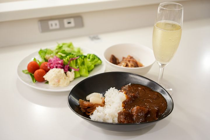 航空会社のラウンジといえば、ビジネスクラス搭乗者やステータス保持者の特権。しかし、この便は深夜発なので1食目の機内食が無い代わりにエコノミークラスでもラウンジが利用できるという、特別な便なのです。私はエコノミークラスでしたがラウンジでワインや食事を楽しみ、旅のスタートから贅沢気分を味わえました……!