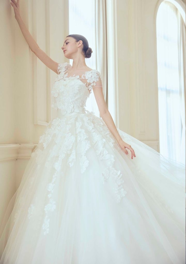 デザイナーのキヨコ ハタさんは20代で東京コレクションブランドのチーフデザイナーとして、モード誌を中心に海外でも活躍。2002年よりウエディング・ドレスのデザインをスタートするとすぐに注目を集め、瞬く間に人気のブランドとなりました。デザインコンセプトは“360度恋するドレス”。トレンドを取り入れつつも品格のある華やかさをまとった洗練のドレスが、花嫁の心をつかんでいます。