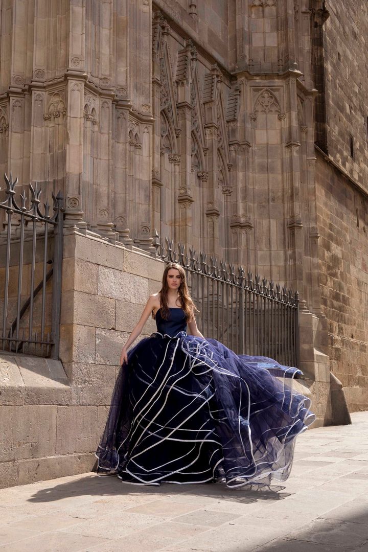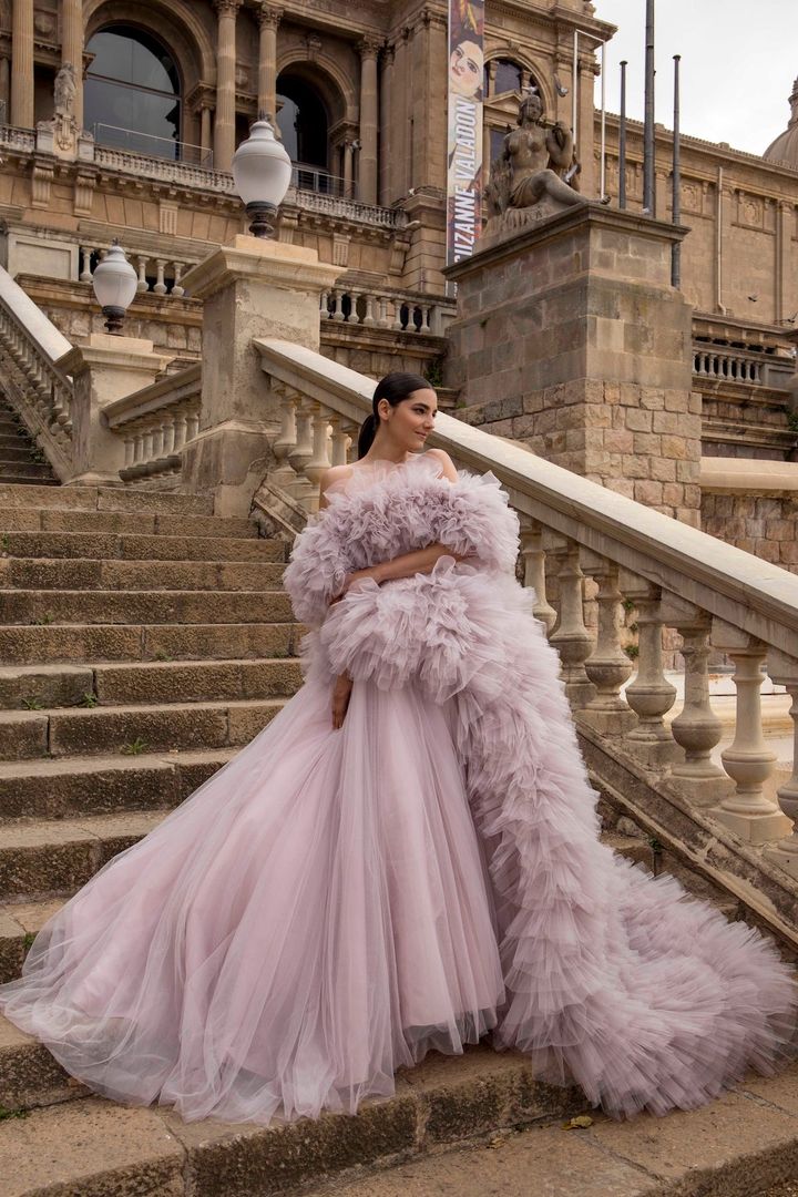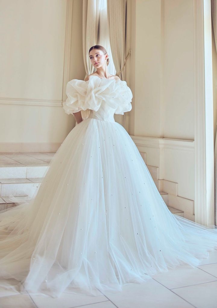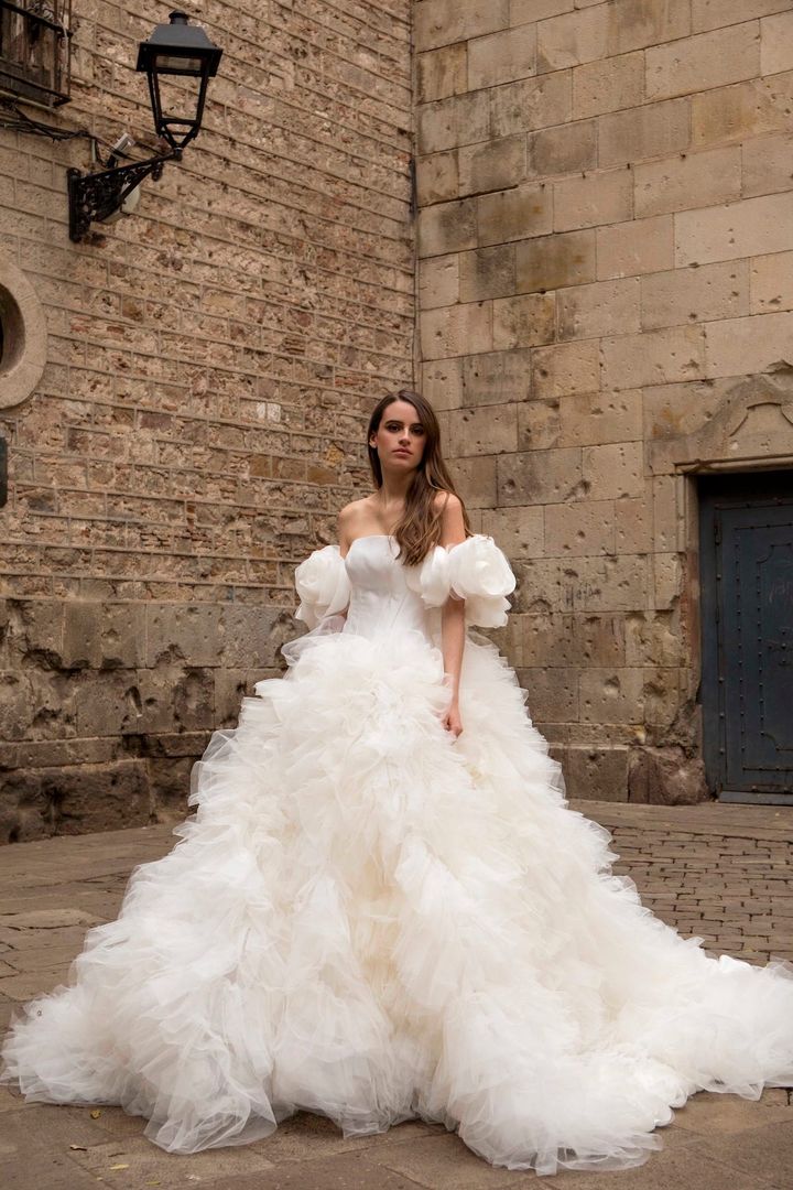 2025年にスペインで行われたバルセロナ ブライダル ファッションウィークで発表したドレス。大胆に配したチュールフリルの存在感が素敵! ドレス レンタル商品(キヨコ ハタ/キヨコ ハタ ウエディングス tel.03-6863-0691)