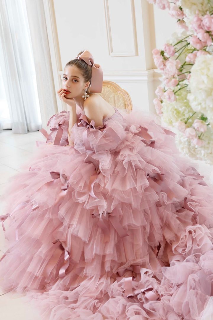 たっぷりのチュールフリルに、上半身の素材と同じピンクのサテンリボンをあしらって。シックなピンクを差し色に入れているので、スイートでありながら大人っぽく着こなせます。ドレス レンタル商品(キヨコ ハタ/キヨコ ハタ ウエディングス tel.03-6863-0691)