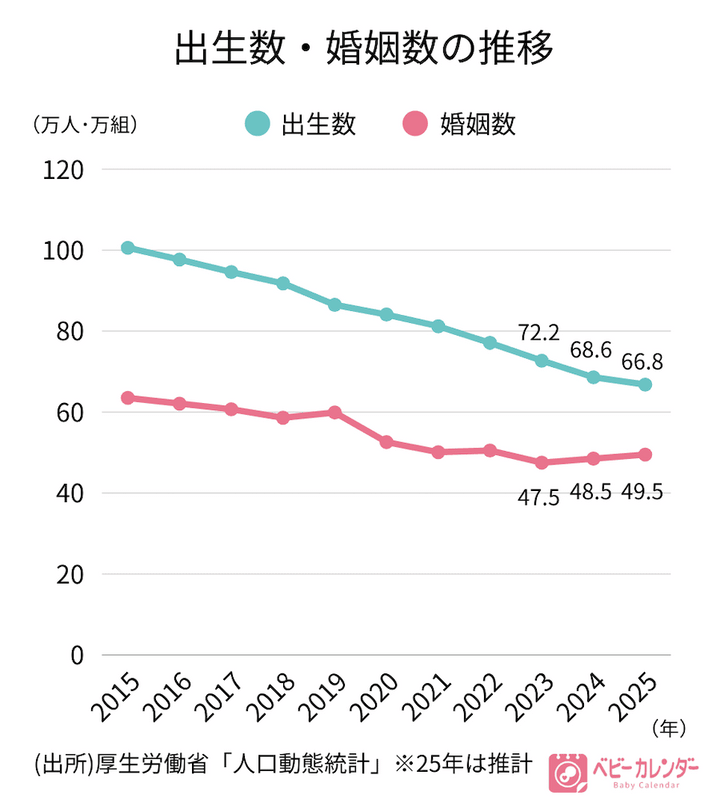 令和7年(2025年)12月23日、厚生労働省は令和7年10月分の人口動態統計速報を公表しました。速報値などを基に計算した結果、2025年の出生数は66万7542人程度(前年比約2.7%減)になる見通しです(※1)。これにより、日本の出生数は2年連続で70万人を割ることとなり、統計開始以来の過去最少を更新する深刻な状況が続いています。