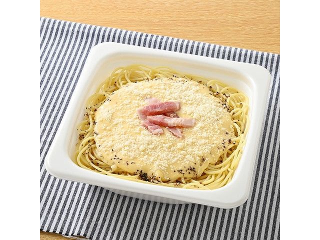 たまごのコクやチーズの風味を強く感じる濃厚ソースが特徴です。ベーコン・パルメザンチーズ・ブラックペッパーをトッピングしました。