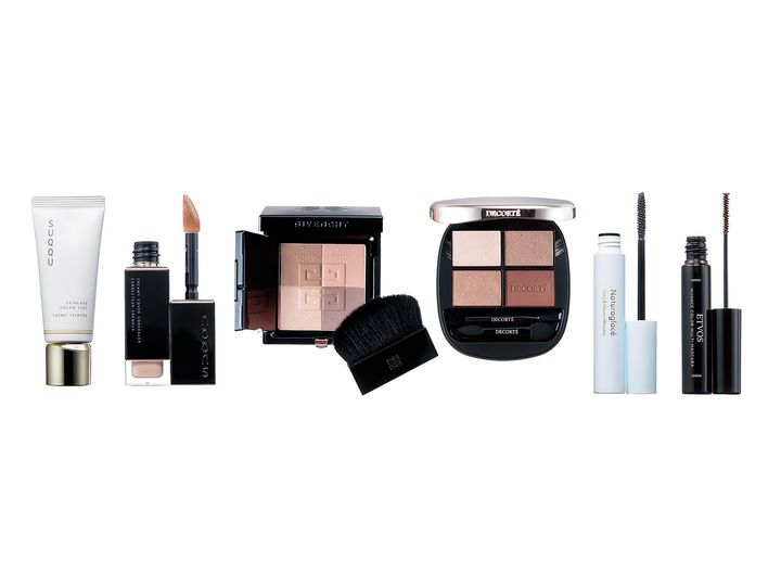 (左から)軽やかに透明感のある肌印象に。SUQQU スキンケア クリーム ティント 15 SPF38・PA++ 40g ¥8,250、ファンデで隠しきれない色ムラは、コンシーラーでピンポイントにカバー。SUQQU クリーミィ カバー コンシーラー C-03 ¥5,500(ともにSUQQU)、全体を馴染ませ繋ぐ。ジバンシイ プリズム・リーブル・ブロンザーパウダー No.001 ブロンズ・シフォン ¥7,480(パルファム ジバンシイ)、ブラウン系のアイシャドウで目元のトーンも揃えます。スキンシャドウ デザイニング パレット 07 Firenze ¥7,700(コスメデコルテ)、漆黒ブラックで目元を引き締め。ロング&ボリューム マスカラN ¥3,080(ナチュラグラッセ)、まつ毛と眉に使える2wayマスカラで眉にニュアンスをプラスして馴染ませます。ニュアンスカラーマルチマスカラ モーヴブラウン ¥2,970 ’26 1/7発売(エトヴォス)