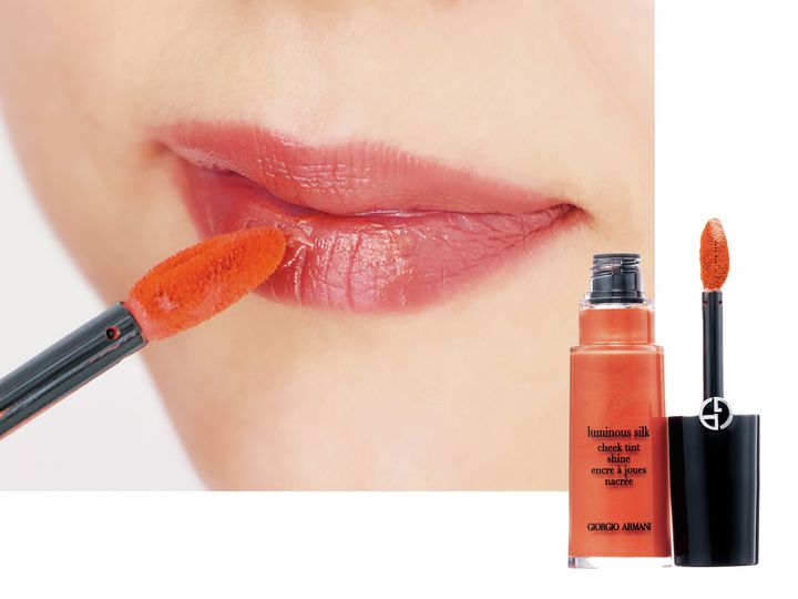 唇中央にツヤのあるリキッドリップを重ねます。パーリィな輝きが立体感を強調しながら、モダンな仕上がりに。さらにチークとして軽く頰にも馴染ませると、口元だけが浮くことなくバランスのとれたメイクに仕上がります。チークにもリップにも使える万能アイテム。ルミナス シルク チーク ティント シャイン #42S ¥7,480(アルマーニ ビューティ)