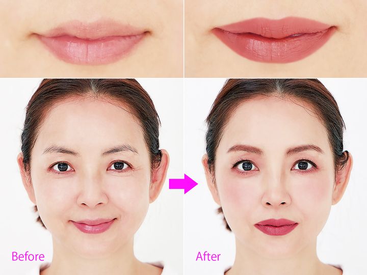 年齢とともに痩せてシワっぽく、くすんで萎んできた唇も、リップメイクで華やかに洗練された印象に。丁寧にラインを取りつつ、アウトラインを柔らかくぼかし、ふっくらとした立体感を演出。色を重ねることで深いブラウン系に仕立て、華やかさの中にも今っぽい抜け感を宿して、女性らしい魅力全開に。