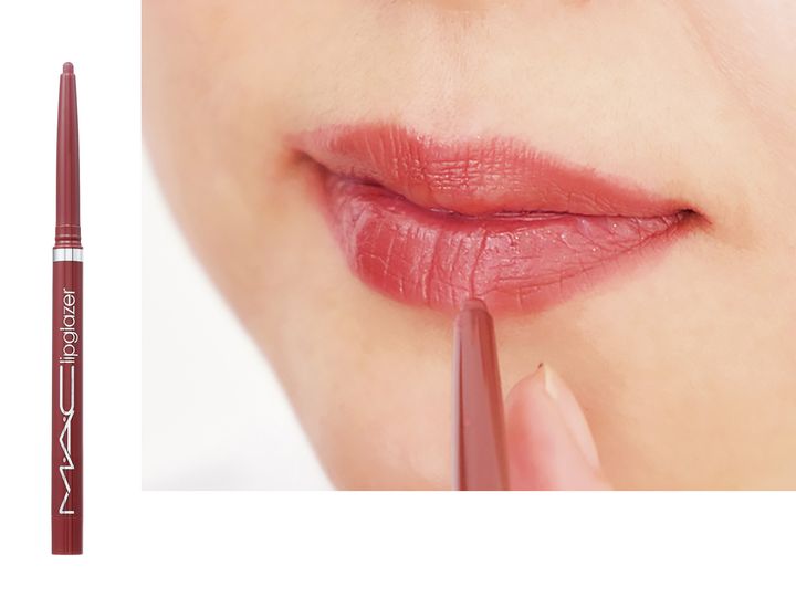 3でティッシュオフした輪郭部分に今度はリップライナーでライン取りします。ティッシュオフしてから、再度ラインを縁取るこのひと手間で、リップも落ちにくくなり、唇もふっくら見え、質感違いにより立体感も生まれます。リップライナーはリップと同じ色みのものを選ぶと馴染みやすく。M・A・C リップグレイザー ワーリン ¥3,960(M・A・C)