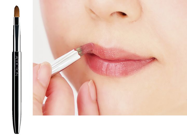 2で直塗りした後に、リップブラシで輪郭や口角などを丁寧に整えます。上唇横側は、ややオーバー気味に輪郭を取り、山の部分は鋭角になりすぎないよう厚みをプラスします。山の部分をシャープに角をつけすぎると老けた印象に。アディクション リップブラシ リトラクタブル ¥3,300(ADDICTION BEAUTY)
