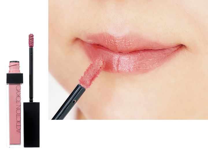 スキンケア発想のリキッドリップをベースに使い、唇の潤いと色みを整えます。オーバーめにラインを取り全体にぼかします。保湿効果で唇もふっくら、リップの仕上がりも長持ち。ナチュラルで肌馴染みがよい万能カラーがおすすめ。アディクション リップ セラム ティント 011 Nude Pink ヌードピンク ¥3,520(ADDICTION BEAUTY)