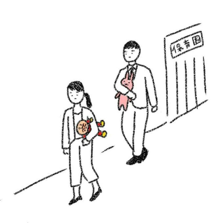 保護者それぞれの腕には、お子さんのお気に入りであろうぬいぐるみが抱えられています。朝の保育園というと慌ただしいイメージがありますが、このイラストに描かれているのは、そんな慌ただしさの中にある心がほんわかする瞬間でした。特別なできごとではないですが、なんとなく心に残る朝の風景ですよね。