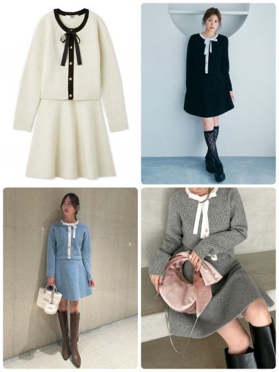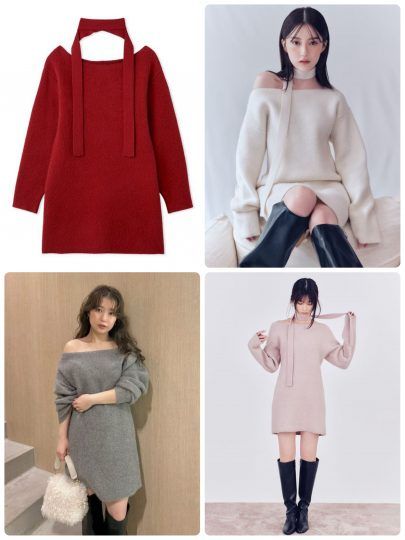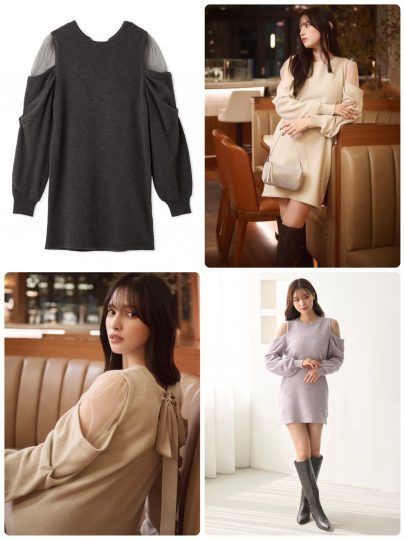 リボンタイ付きのチュニックワンピースとニットをセットに。単品使いも可能なので着こなしの幅が広がるはず。