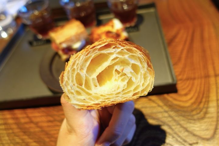 断面は薄い生地が細かく何層にも重なっており、外側はさっくり、内側はしっとりの食感がたまりません。麻布台ヒルズ店ではなるべく焼きたての状態を楽しめるように、1日に2回に分けて焼き上げることで作りたての味わいを届けているのだそう。シンプルだからこそ、バターの味わいと生地の食感がより引き立つクロワッサンです。