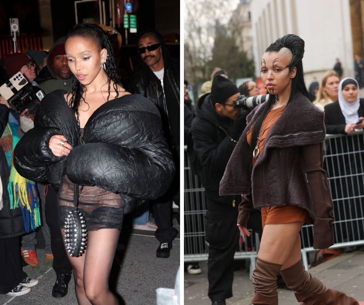 いつもオリジナリティあふれるヘアスタイルで登場するFKAツイッグス。今回も大胆なアレンジを利かせたヘアに。唯一無二の存在感がかっこいい。