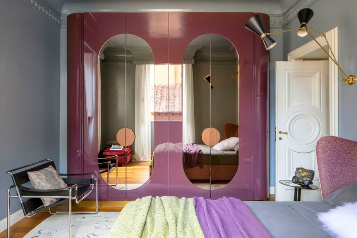 マスターベッドルームの扉を開けると、また雰囲気が一変する。ここでは、ソフトなブルーに塗られた壁面と、ヴェントゥローニ・スタジオがデザインし、プラム色のラッカーで仕上げたカスタムメイドのワードローブが共鳴する。
