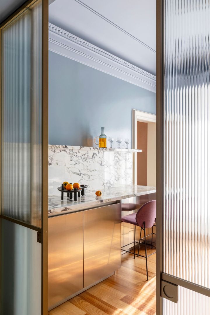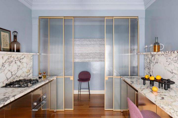 「リビングの仕上がりはとても気に入っているのですが、キッチンの親密さや、ここを照らす光も好き」とジュリア。「午後になると、大理石と金属に日が当たり、輝き出します。そして、ガラス扉がこの空間を隠すことなく、他の部屋から隔ててくれる。友人が来たときはここでコーヒーを振舞ったり、ときには1人で書き物をしたりすることも。すごくエレガントな環境が整っていると思います」
