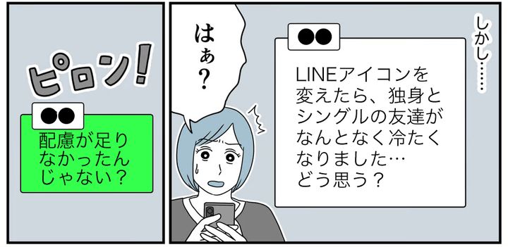 『LINEアイコンを変えたら、独身とシングルの友達がなんとなく冷たくなりました。アイコンは、子どもたちが並んでいる後ろ姿ですが、それが家庭円満アピールをしていると2人の気に触ったみたいです。ある友達からは「配慮が足りなかったんじゃない?」と言われてしまいました。こんなことで嫌われるのだと驚きました。私の配慮不足ですか?』出典:https://mamastar.jp/bbs/topic/4500034