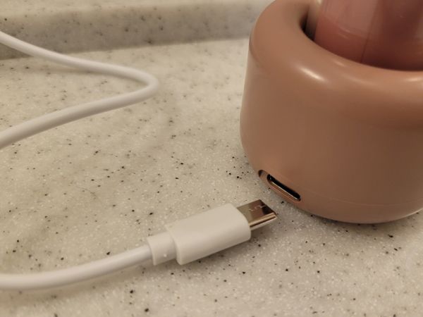 充電はType-A端子で、立てておくだけ。約15時間のフル充電で、1日4分使用の場合、約1カ月使用可能。洗面台にもスッキリ置いておけます。