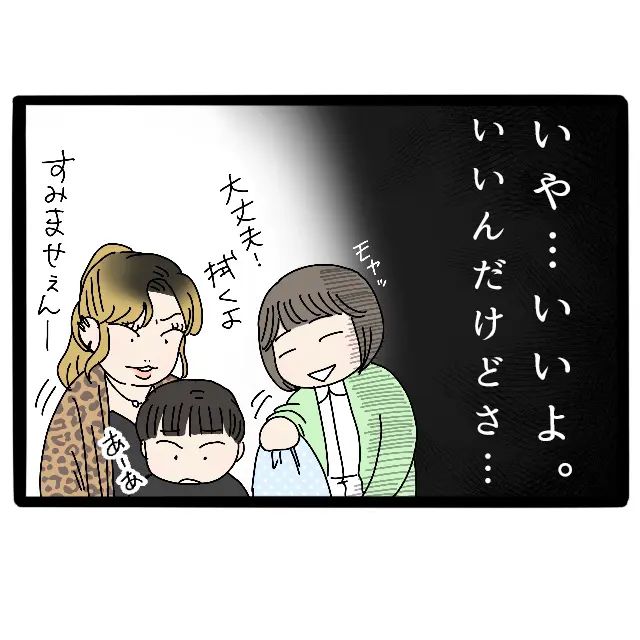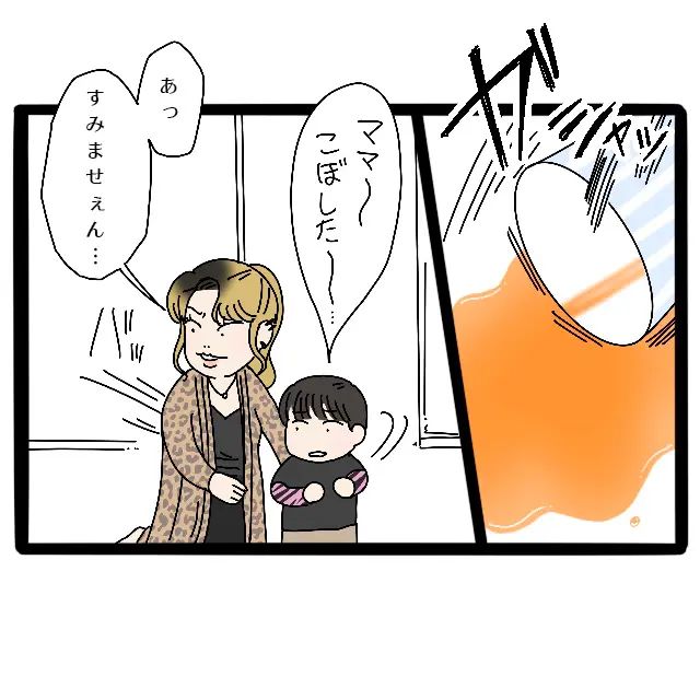 大人たちが外食のことを話しているそばで、ジュースを飲んでいたコウキくんがこぼしてしまいました。慌ててサチさんが「すみませぇん」とコウキくんのそばに来つつ、私に声をかけてきました。