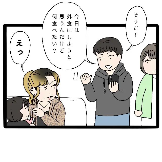 信也君たちが到着してしばらくして、達也が夕飯を外に食べに行こうと提案しました。何を食べたいかサチさんたちに聞くと、サチさんは「えっ」と明らかに意外という顔をしました。
