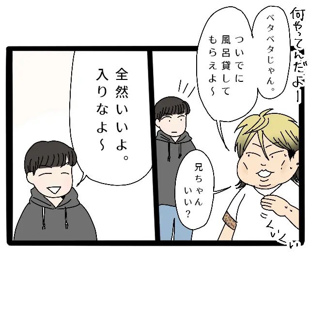 信也君は「何やってんだよー」と言いながら「ベタベタじゃん。ついでに風呂貸してもらえよ~」と面倒くさそうに言いました。信也君に「兄ちゃんいい?」と聞かれた達也は「全然いいよ。入りなよ~」と笑顔で言いましたが、え?ジュースこぼしただけなのにと、私だけは思っていましたが。