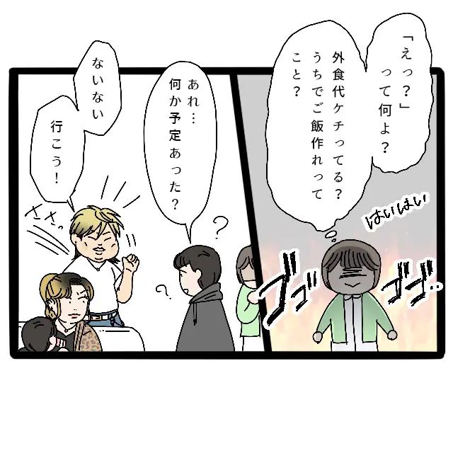 サチさんの様子を見ていた私はまた怒りがわいてきてしまいました。どうして意外そうな顔をするの?「えっ?」ってなによ?黙ってはいたものの、外食代をケチっていると思っているのだろうか、うちでご飯を作ってもてなせってことかしら、などと内心穏やかではありません。不思議に思った達也が「何か予定あった?」と聞くと、なぜか信也君が慌てて「ないない、行こう!」とサチさんを遮って外食に賛成しました。そんな信也君をサチさんは怪訝そうな顔で、ただ黙って見ていました。