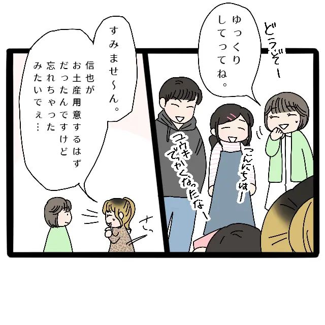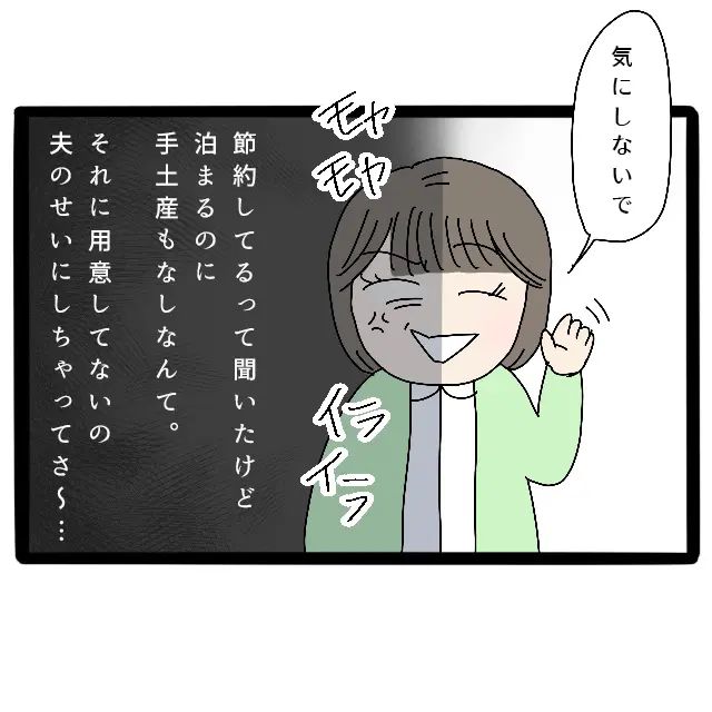 「気にしないで」と笑顔で返したものの、内心ではイライラとモヤモヤが入り交ざっていました。サチさんは節約家だとお義母さんから聞いてはいましたが、泊まることをお義母さんに頼ませて、手土産ひとつも持ってこないなんて図々しい。それに、お土産を忘れたことを夫のせいにするなんてと呆れてしまいました。別にお土産が欲しかったわけではありませんが、義母からの電話でサチさんへの印象が悪かったのが正直なところです。