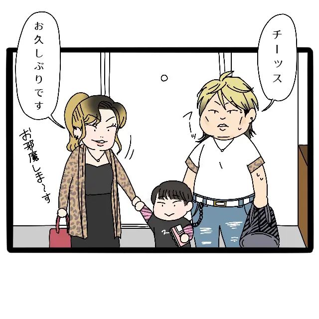 3歳の息子コウキくんを連れて我が家に到着した信也君家族は、なんとも派手な服装です。