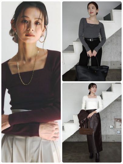 大胆すぎず、かといって控えめすぎないネックのあき具合がポイント。アクセが映える点も◎です。ボディラインに程よくフィットするシルエットで女性らしさも満点。
