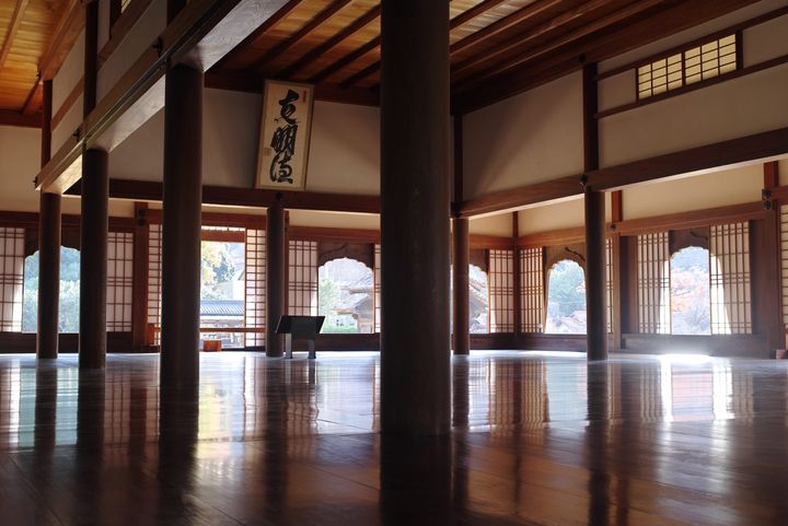 内部は10本のケヤキの丸柱で支えた内室と、その四方を囲む入側(いりかわ)で構成。拭き漆の床は生徒たちによってよく磨かれており、火灯窓から入る光をやわらかく反射させている。