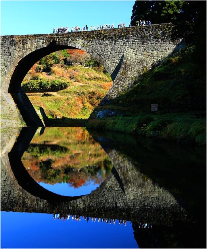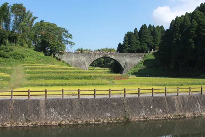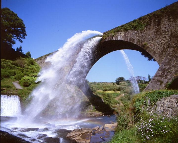 1854年に完成した長さ約78m、高さ約21.3mにおよぶ近世最大級の石造アーチ水路橋。周囲を谷と河川に囲まれている水源に乏しい白糸大地へ農業用水を送るため、五老滝川に架けられた。アーチ橋に凝灰岩製の通水管をのせる独特の構造で、今も約100haの水田を潤している。