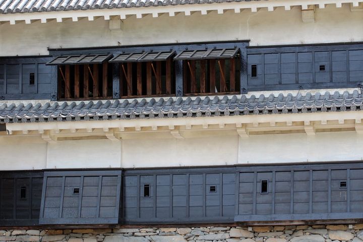松本城天守の外壁の上部は白しっくい仕上げで、下部は黒漆塗の下見板。この下見板の役割は、屋根で防ぎきれない雨水をはじいて天守の壁を守ることだった。