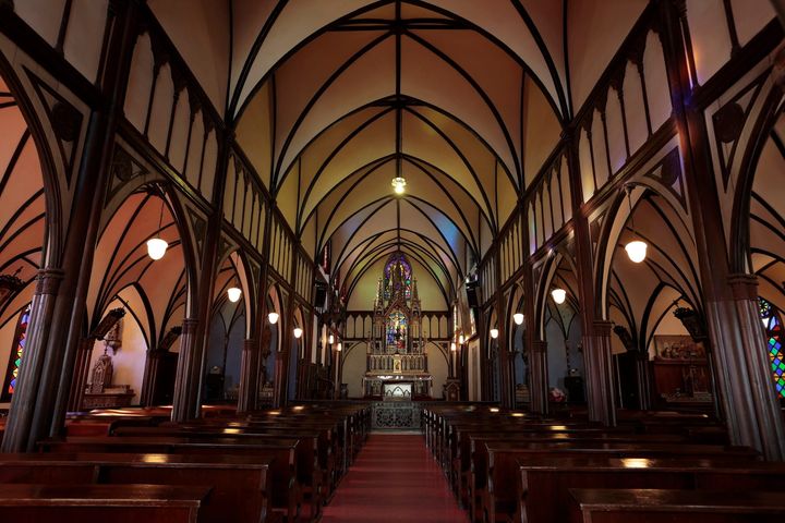 入り口に立つマリア像を見ながら足を踏み入れると、中央大扉尖頭式アーチ形の窓や大祭壇などに設えられたステンドグラスが、教会内に色とりどりの光を取り込む。