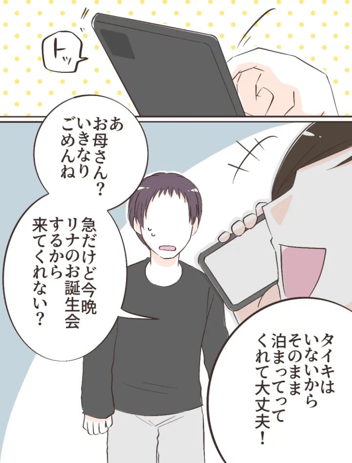 「あお母さん?いきなりごめんね。急だけど、今晩リナのお誕生会するから来てくれない?タイキはいないからそのまま泊まってってくれて大丈夫!」