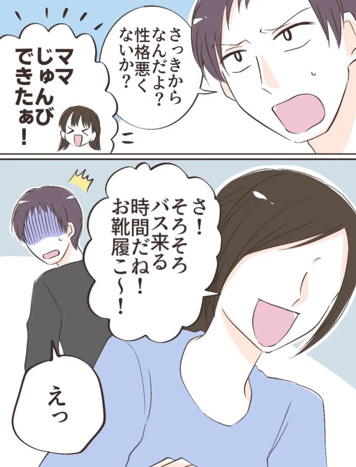 「さっきからなんだよ?性格悪くないか?」タイキがそう言うのと同時に、「ママじゅんびできたぁ!」とリナの声が。「さ!そろそろバス来る時間だね!お靴履こ~!」とリナに駆け寄ろうとすると、「えっ」と驚くタイキの声が。