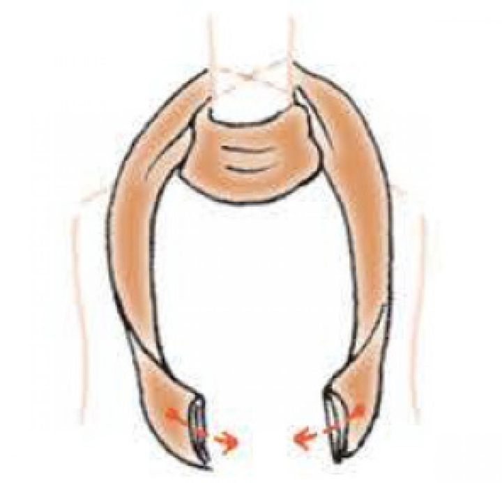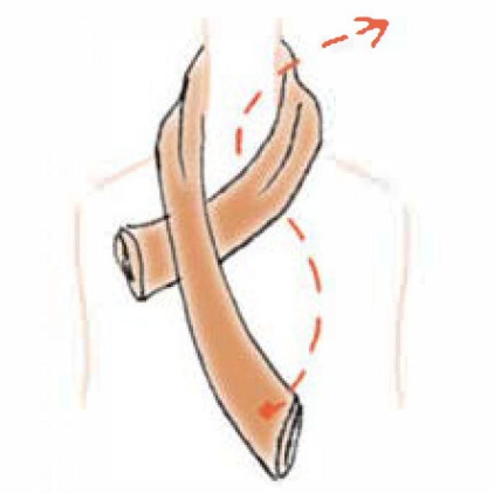 【2】片方を少し長めにし、短いほうの上に交差させる。