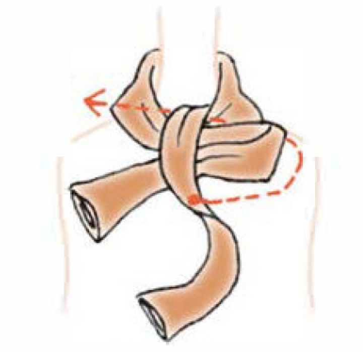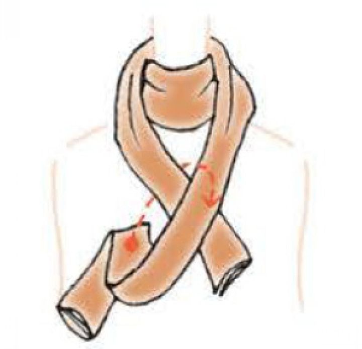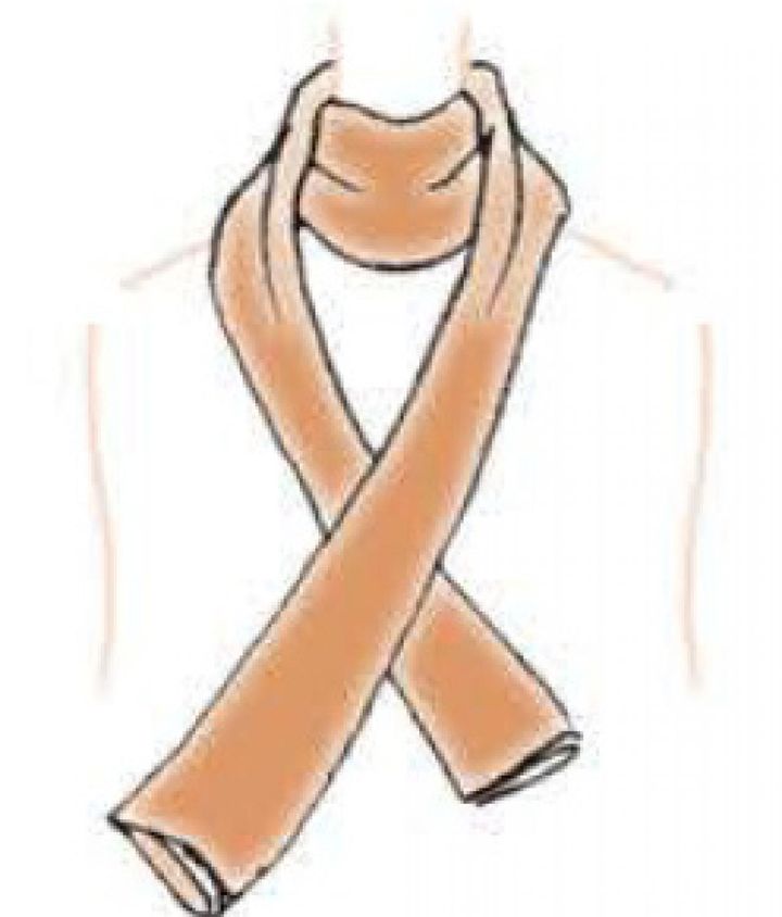 【1】4つ折り(※1)にしたスカーフを首にひと巻きし、両端を前にたらす。