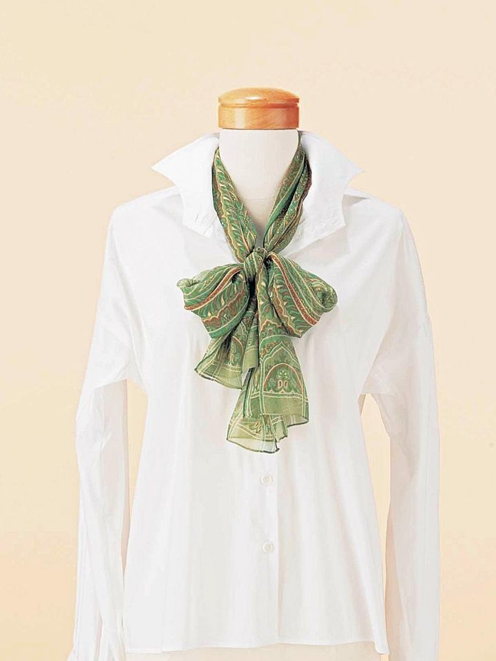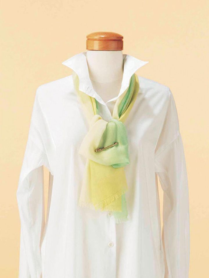 プロセス【3】で、輪を首元にもくぐらせます。ルーズに巻いてピンブローチでとめると大人っぽく、また、ひらひらしないのでオフィスでも好印象。