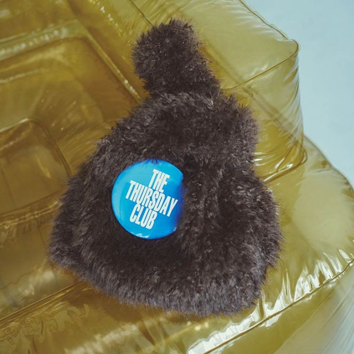 毛足の長い深紅のニットカーデにビッグカラーのブラウスを合わせて思いっきり甘く♡ ただし、デニムとキャップで全体のバランスUPもお忘れなく。