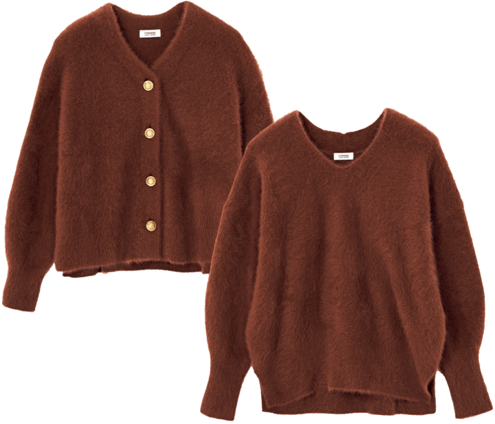 左から:金ボタンがクラシック。カーディガン¥28,600、左のカーデを肩掛けしても。ニット¥26,950(共にジャーナル スタンダード レサージュ/ジャーナル スタンダード レサージュ 銀座店)