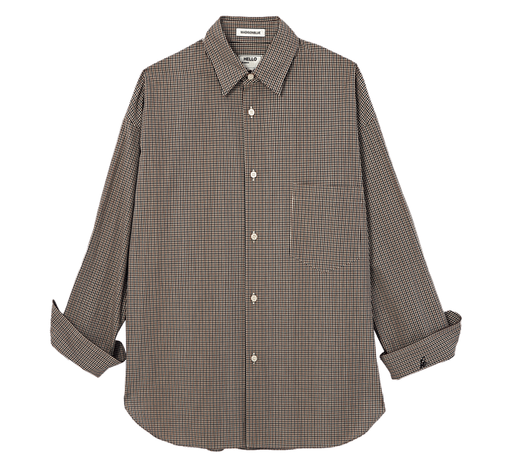 チェックシャツはユニークなフード付き。オーバーサイズの裾をキュッと縛って遊び心をプラス。きちんと感のあるチェックシャツをもっと自由に楽しんで。シャツ¥25,300、デニムパンツ¥25,300(共にプランクプロジェクト/プランクプロジェクト 青山店)、シューズ¥176,000(ジェイエムウエストン/ジェイエムウエストン 青山店)