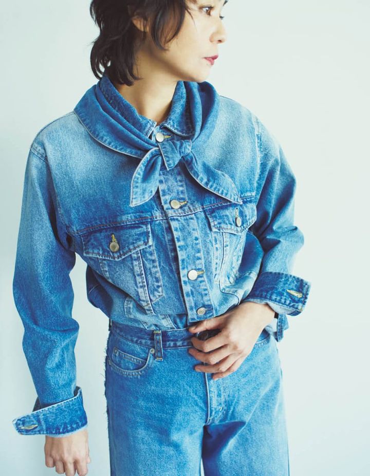 デニムジャケットのようなデザインのシャツは、パンツにインしてすっきりと着られるのが◎。スカーフがあるだけで着映え力がグッと高まる。デニムシャツ¥42,900※スカーフ付き、デニムパンツ¥37,400(共にサージ/ショールーム セッション)