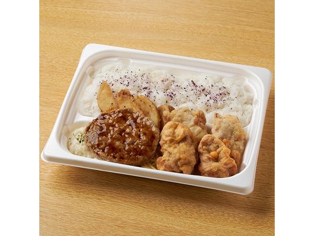 ゆかりをふりかけたご飯に、塩から揚げ・醤油から揚げの2種類の味のから揚げと、照り焼きソースのハンバーグをトッピングしたお弁当です。 北陸で販売
