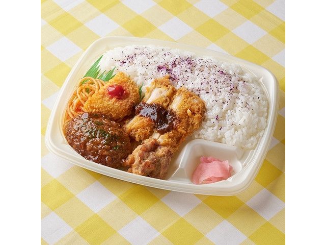 大盛ごはんに、人気のおかずを組み合せたミックス弁当です。おかずは、みそタレをかけたチキンカツ・オニオンソースのハンバーグ・から揚げ・コロッケ・ナポリタンです。 ※静岡県(東部)では取り扱いがございません。 東海で販売