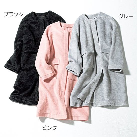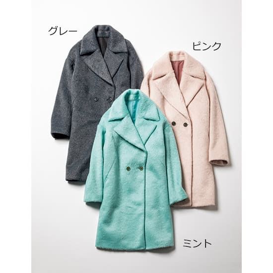 シャギー素材とゆる感のノーカラーデザインがマッチしたコート。ウール混のシャギーは、一枚で暖かでニットのように楽ちんだからヘビロテ間違いナシです。